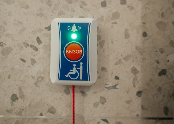 для ориентации (тактильной плиткой, кнопкой вызова помощи, звуковой или визуальной информацией.